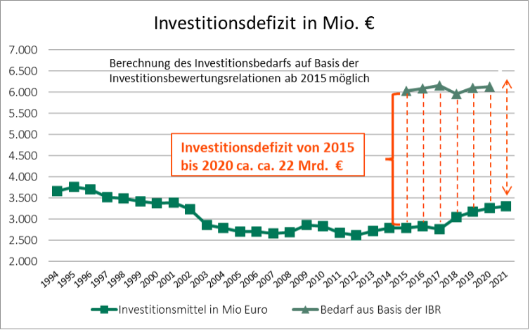 Eine qualitativ hochwertige Versorgung der Patient:innen erfordert eine laufende Investition in die medizinischen Anlagen, Räumlichkeiten und Digitalisierung. Gemeinsam mit der Krankenhausplanung obliegt die Finanzierung der Krankenhausinvestitionen im Verantwortungsbereich der Länder. Dieser Verantwortung kommen die Länder seit Jahren nicht im vollen Umfang nach. Einer Auswertung der DKG zufolge beträgt das Investitionsdefizit für den Zeitraum von 2015 bis 2020 einen kumulierten Wert von 22 Milliarden Euro (siehe Abbildung 3). Die Regierungen der Bundesländer tragen somit eine Mitverantwortung an der wirtschaftlichen Notlage der Krankenhäuser.