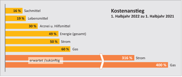 Die Energiekrise und die steigende Inflation aufgrund des russischen Angriffskriegs auf die Ukraine haben großen Einfluss auf die wirtschaftliche Situation der Rehabilitations- und Vorsorgeeinrichtungen. Im Jahresdurchschnitt 2022 gegenüber 2021 stieg die Inflationsrate auf +7,9 Prozent, die Lebensmittelpreise verteuerten sich um 13,4 Prozent und die Energiepreise um 34,7 Prozent. Insbesondere erhöhten sich die Preise für Erdgas +64,8 Prozent und Strom +20,1 Prozent (vgl. Statistisches Bundesamt vom 17.01.2023).