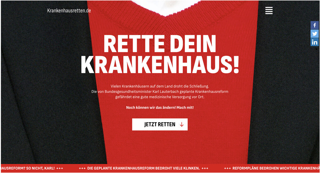 Unter der Adresse www.krankenhausretten.de ist eine Website als zentraler Informations- und Aktionspunkt der BDPKKampagne erreichbar. Hier werden in komprimierter Form die wesentlichen Kritikpunkte, die zu erwartenden negativen Folgen der Reform sowie die Forderungen und Verbesserungsvorschläge des BDPK dargestellt. Ein kurzes Erklär- video widmet sich der größten Sorge: Das Reformziel, die Versorgung auf große Zentren in den Städten zu konzentrieren, würde dazu führen, dass viele Patientinnen und Patienten kein Krankenhaus mehr in ihrer Nähe hätten und medizinisch schlechter versorgt wären.