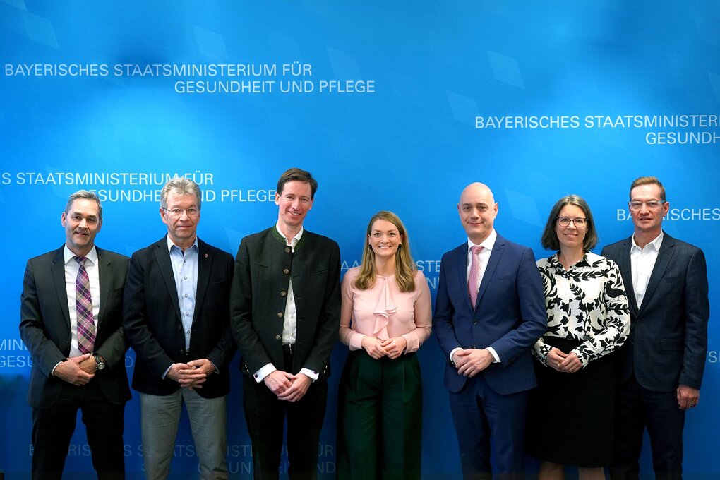 Der Besuch diente dem Austausch über aktuelle gesundheitspolitische Themen wie der Investitionsförderung in Bayern und dem Ungleichgewicht bei der Finanzierung von Akutkrankenhäusern durch den Defizitausgleich von Kommunen. Diskutiert wurde auch die Behebung von Konstruktionsfehlern in der aktuellen Krankenhausreform. An dem Gespräch nahmen teil (im Bild v. l.): Geschäftsführer Michael Strobach, Vorstandsvorsitzender Stefan Scharl, Vorstandsmitglied Ludwig Kitzsch, Gesundheitsministerin Judith Gerlach, Vorstandsvorsitzender Markus Stark, Hauptgeschäftsführerin Dr. Ann-Kristin Stenger und Vorstandsvorsitzender Dr. Joachim Ramming. Gesprächsteilnehmer war außerdem der Leiter der Abteilung Krankenhausversorgung beim Bayerischen Gesundheitsministerium, Herwig Heide.