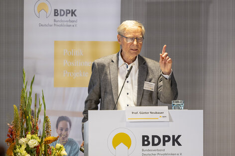 Um eine solche Entwicklung in Deutschland zu verhindern, müssen aus Sicht des BDPK schon jetzt die politischen Weichen für die Zukunft gestellt werden und es sind innovative Ansätze erforderlich. Dazu stellte der Münchener Gesundheitsökonom Prof. Dr. Günter Neubauer ein Konzept zur Diskussion, mit dem die Eigenverantwortung der Bürger:innen und Regionen gestärkt werden soll. Sein Konzept sieht vor, dass die Patient:innen nicht mehr wie bisher nur passive Steuerungselemente sind, sondern zukünftig aktive Mitentscheider der Versorgungslandschaft werden. Das wäre ein enormer Ansporn für die Kliniken, wirtschaftlicher zu arbeiten. In der anschließenden Diskussion nahm Johannes Wolff, Leiter des Referats Krankenhausvergütung der Abteilung Krankenhäuser beim GKV-Spitzenverband, spontan die Einladung an und ergriff auf dem Podium das Wort. Er wies da- rauf hin, dass die Qualität Maßstab für alle Reformüberlegungen bleiben müsse – was nach Auffassung der Diskussionsteilnehmer mit dem vorgestellten Konzept völlig in Einklang steht.
